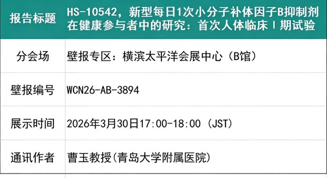 HS-10542 是一种针对补体因子B的小分子抑制剂,目前正处于针对补体介导的相关疾病临床开发阶段。在WCN2026会议上,一项首个人体、随机双盲、安慰剂对照、单中心临床Ⅰ期研究数据发布,该研究旨在评估 HS-10542 在健康参与者中的安全性、耐受性、药代动力学(PK)和药效学(PD)特征。